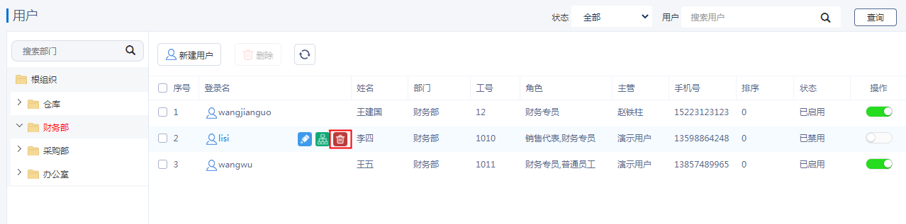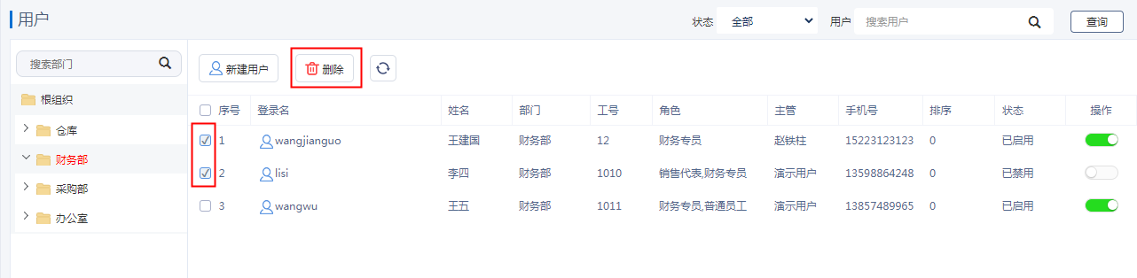 也可勾选需要删除的用户,使用全局操作[删除]按钮进行用户批量删除。