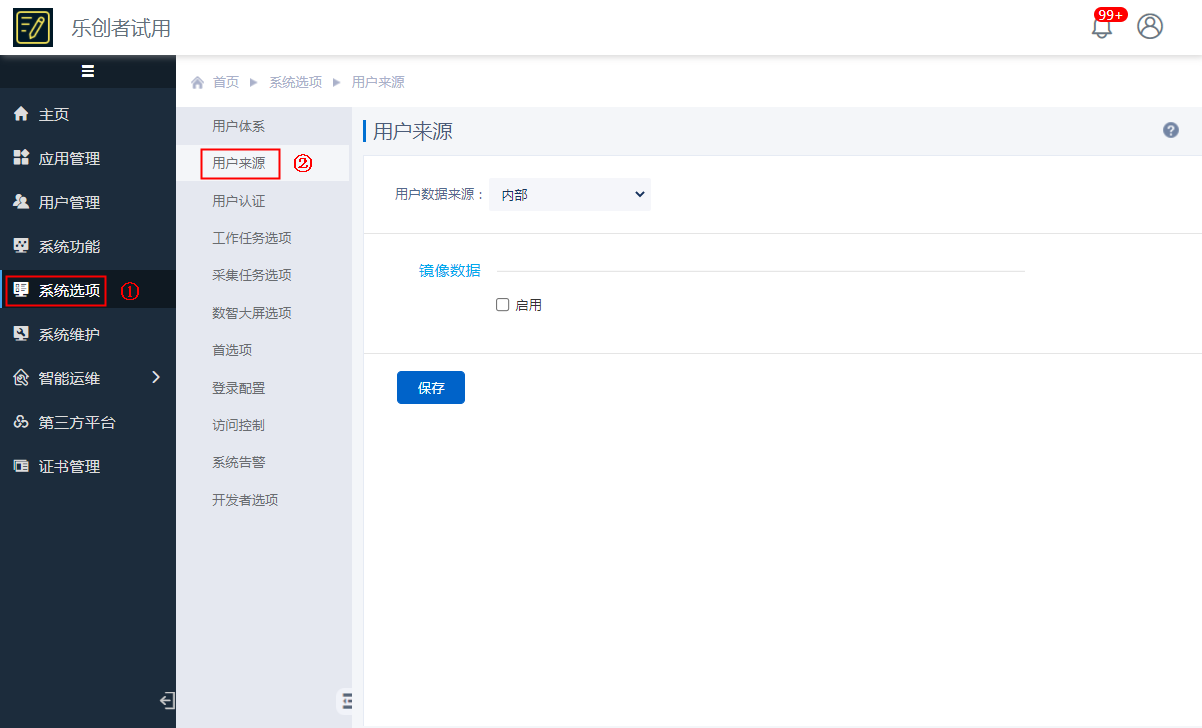 系统管理员登录系统,执行「系统选项>用户来源」菜单,如下图: