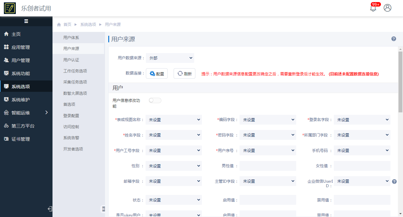 注:在用户体系设置中,如果启用了“分级”和“主子账号”中的任何一个,则用户数据来源只能使用“内部”方式。