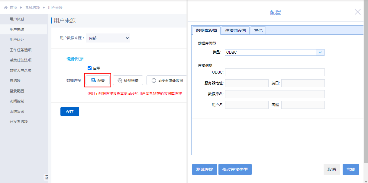 首先,勾选“启用”功能,进行数据连接配置,同外部用户的数据连接配置。