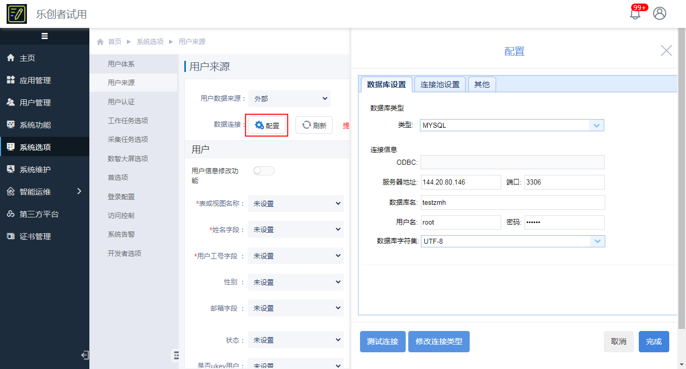数据连接配置完成后,就可以进行用户相关信息的映射关系设置了。