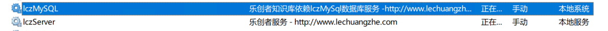 在Windows服务中,存在名为“lczMySQL”的MySQL服务,是作为所安装的lczServer服务配套的知识库,具体配置为: