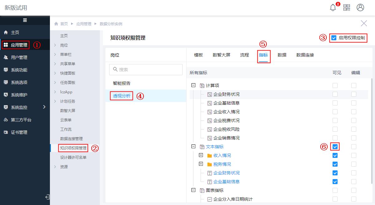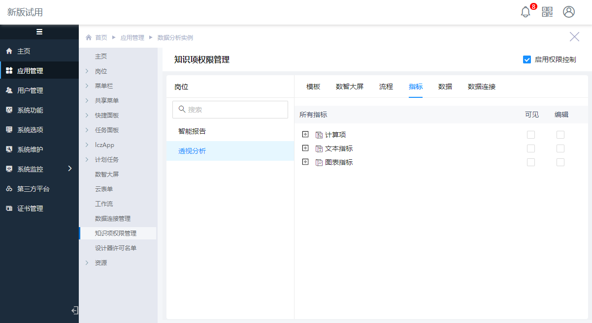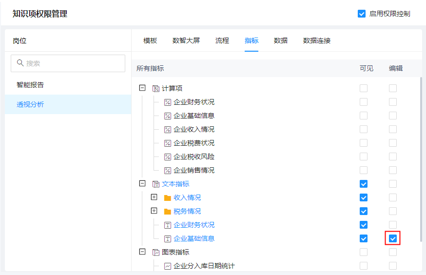点击“知识项权限管理”菜单,勾选“启用权限控制”,选择“透视分析”岗位,为“指标”权限中的“文本指标”目录勾选[可见]权限,如下图: