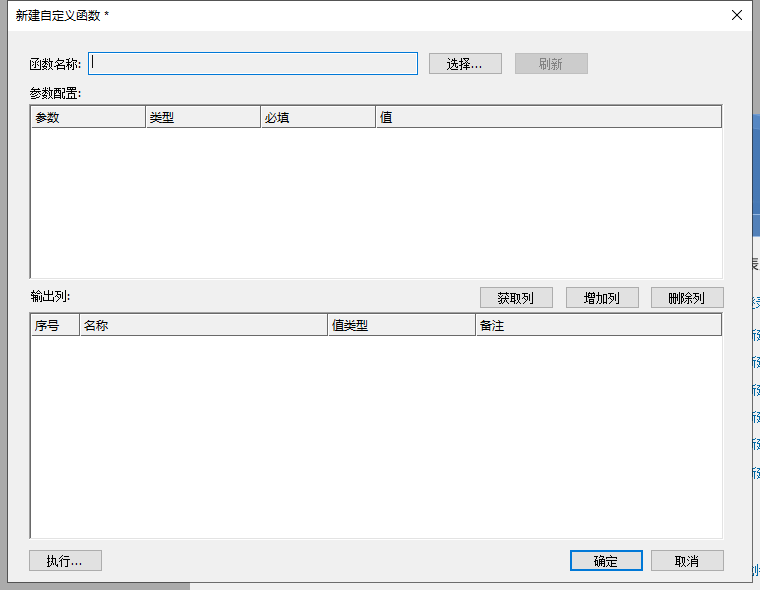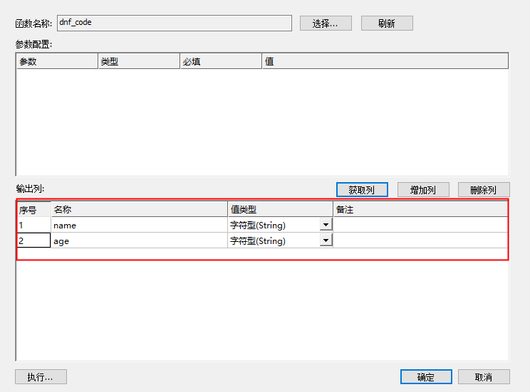 输出列是执行后的字段,可以手动“增加列”、“删除列”,也可以“获取列”,或自动解析该函数中返回的字段