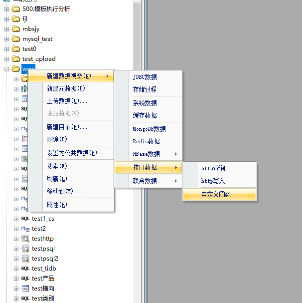 “数据”根目录或子目录右键执行“新建数据视图>接口数据>自定义函数”菜单,创建一个自定义函数视图。