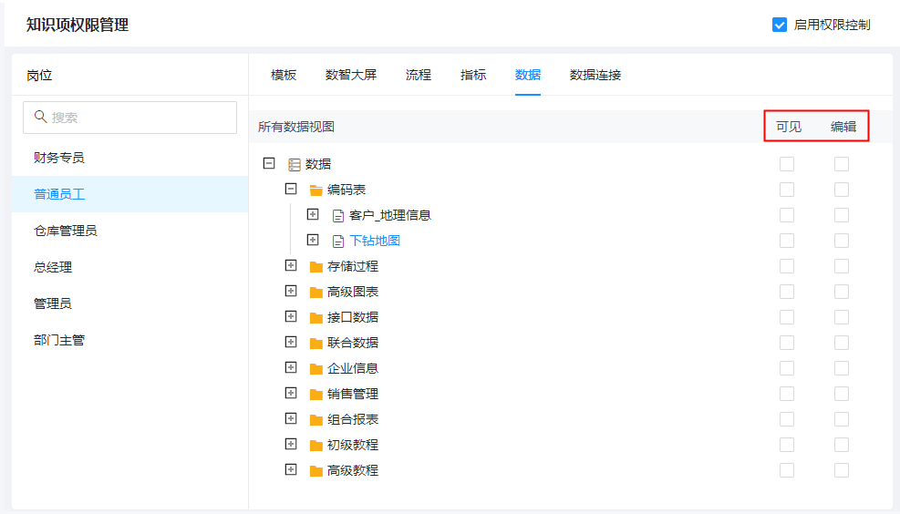 指标、数据、数据连接的权限配置中,可以为岗位分配可见和编辑权限,如下图所示: