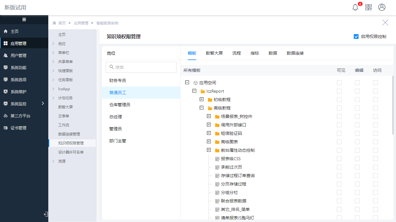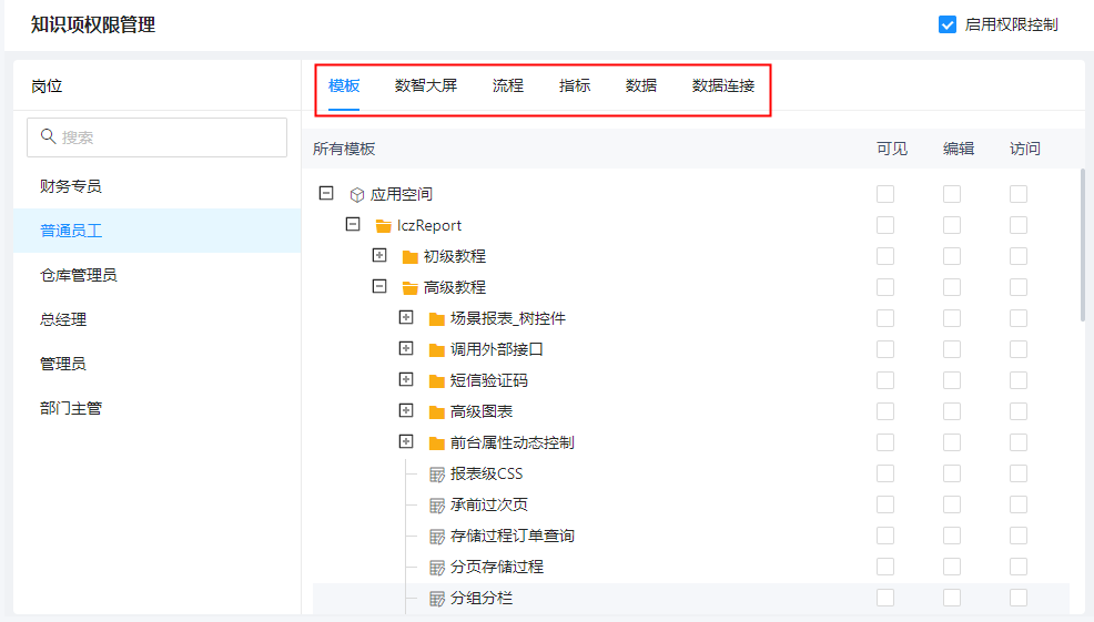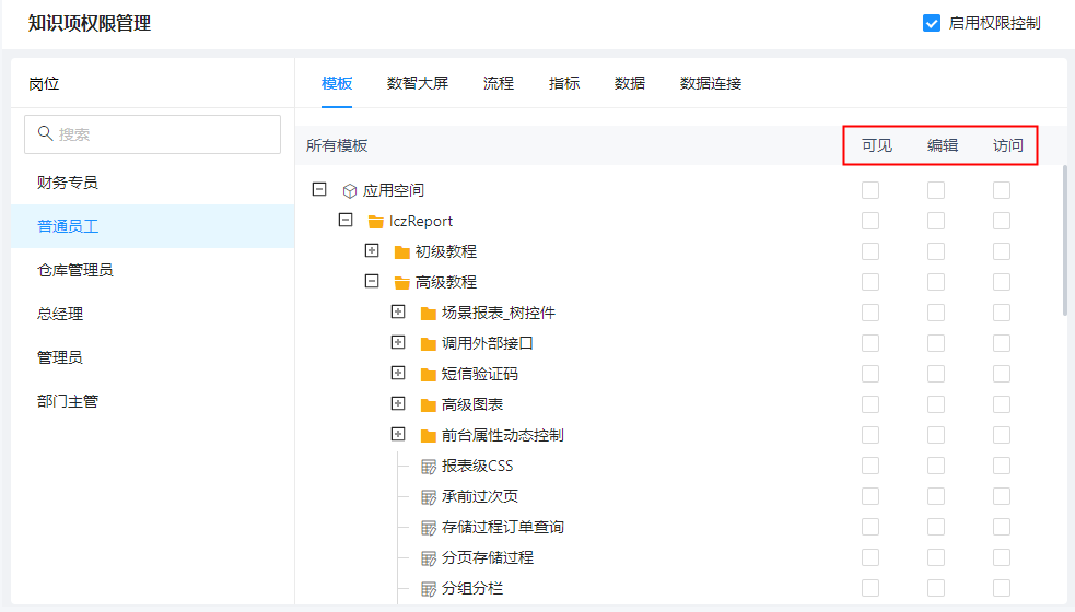 模板、数智大屏、流程的权限配置中,可以为岗位分配可见、编辑、访问权限,如下图所示:
