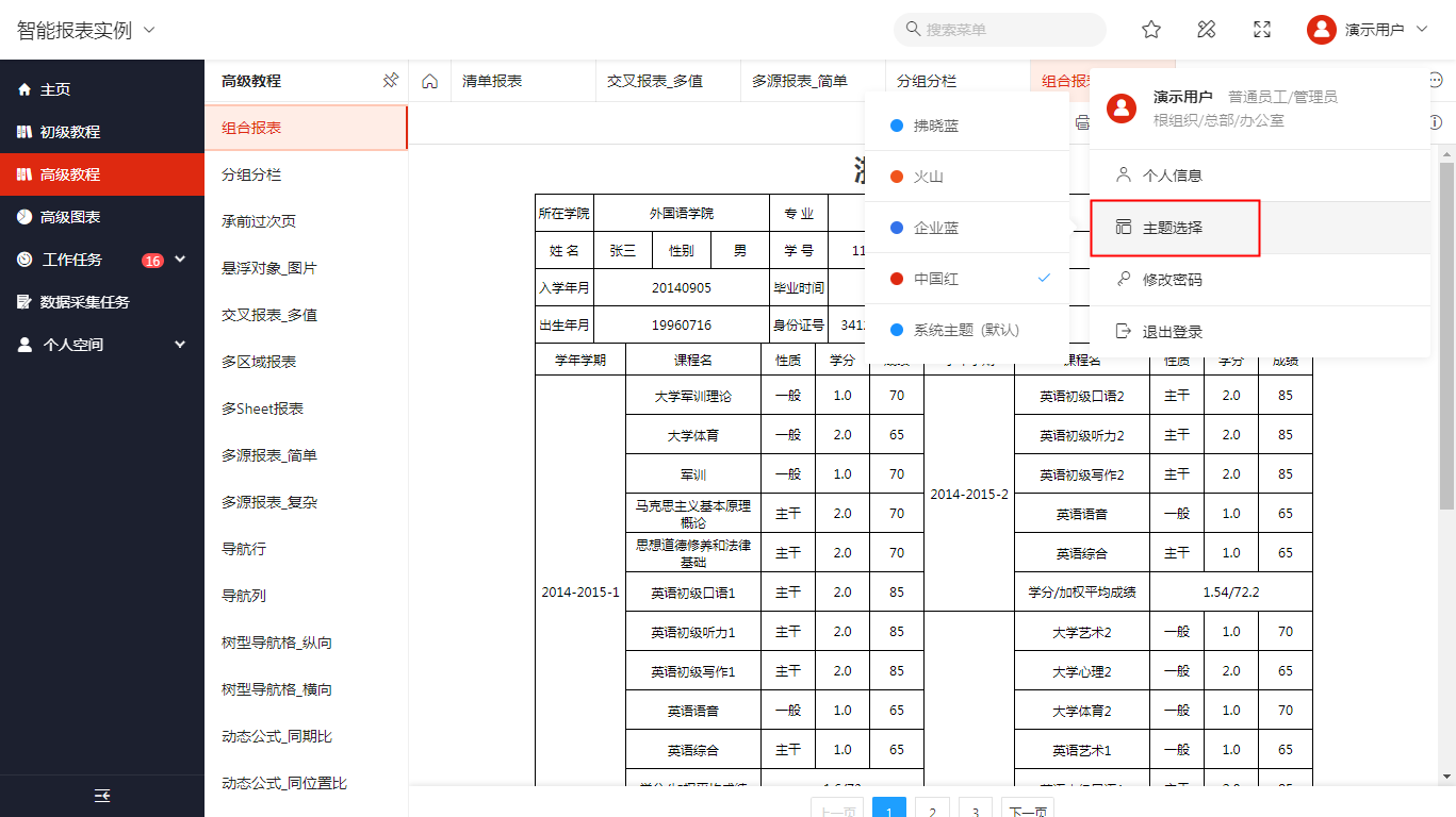 比如我们将主题切换为“企业蓝”,则效果如下图: