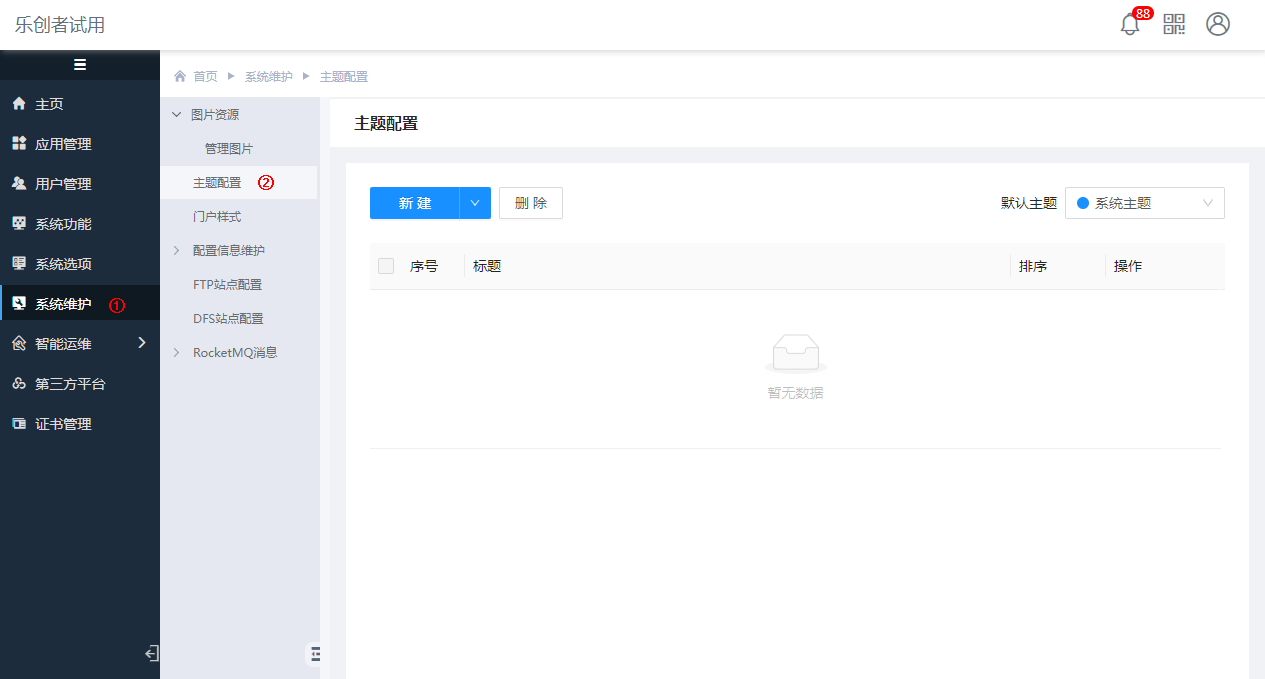 以“系统管理员”身份登录系统,进入“系统维护–》主题配置”界面,如下图: