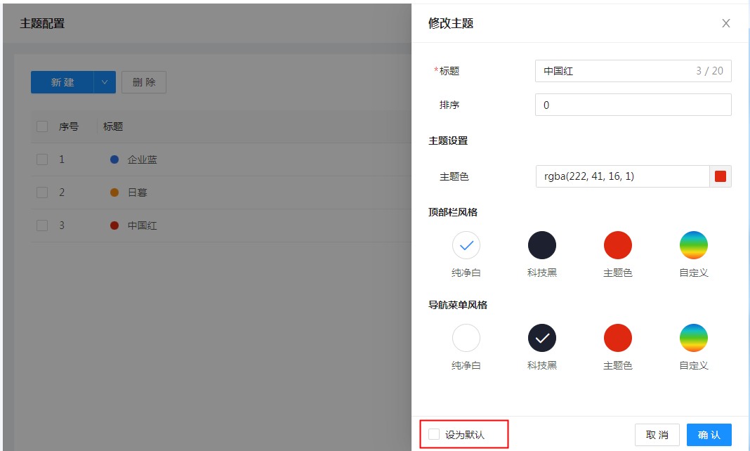 2)也可以通过列表中的“默认主题”下拉选项中选择一个配置的主题作为默认主题,其中系统主题为系统内置的主题。比如:将“中国红”设置为默认主题。