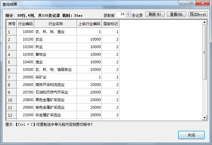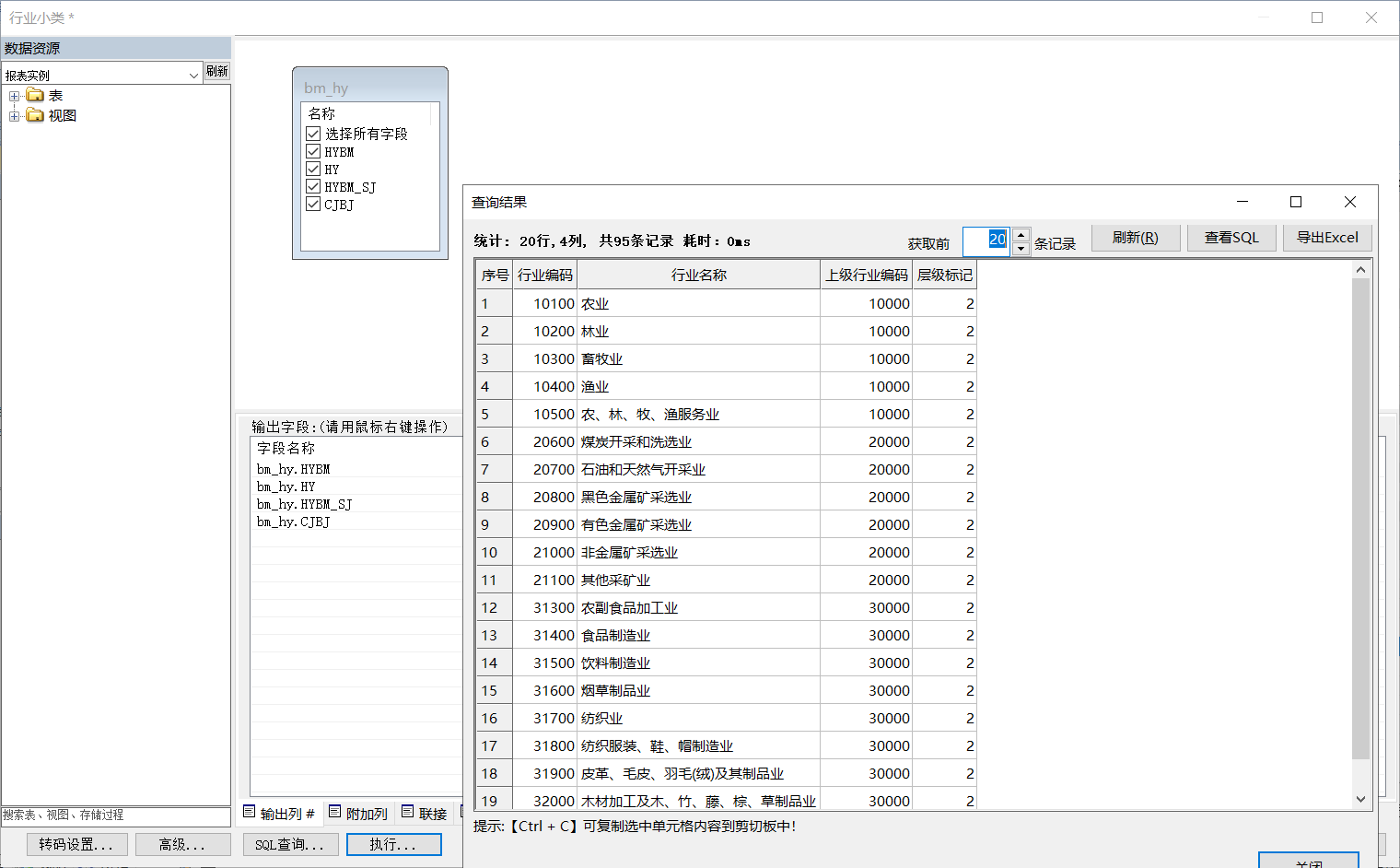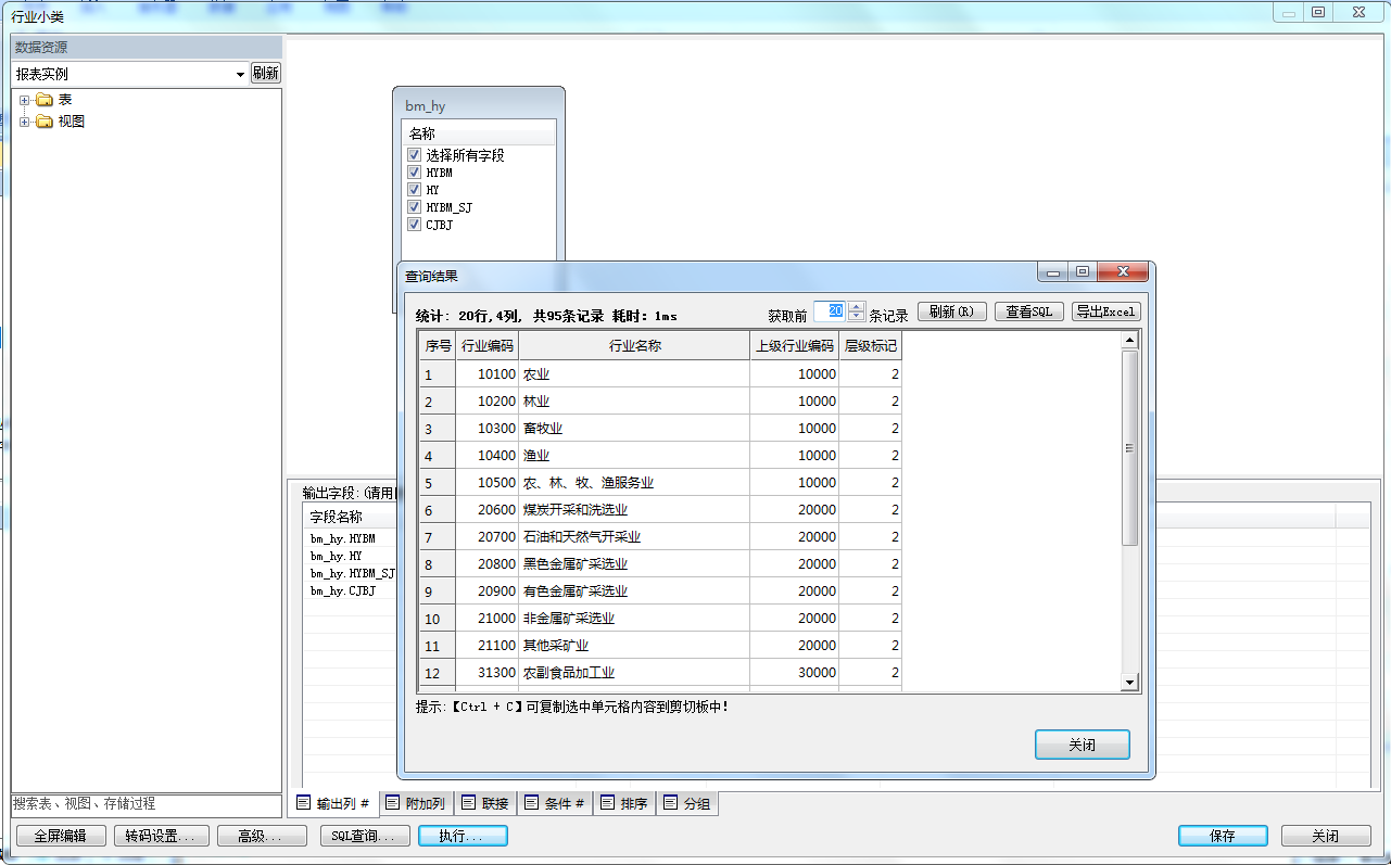从查询结果可以看出,“纵向联合”数据视图已经对数据进行了整理,合并了行业大类和行业小类表中的数据。