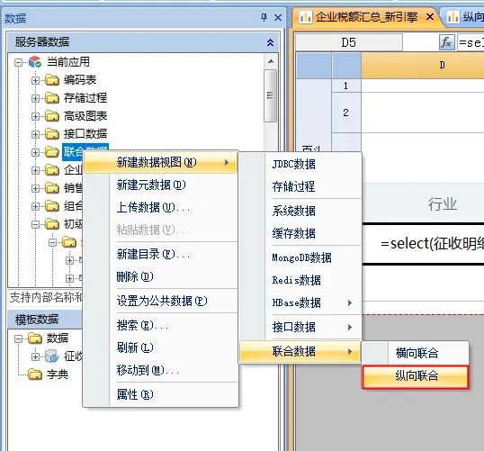 通过 “新建数据视图->联合数据->纵向联合” 菜单创建横向联合数据视图,如下图: