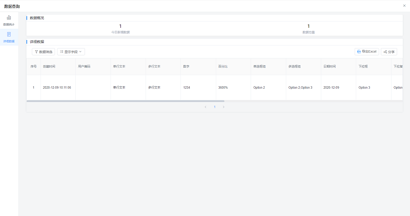 系统管理员和具有云表单访问权限的普通用户,登录系统后,进入“云表单管理–》表单–》数据查询”,在“数据查询”中查看表单数据,包含“数据统计”和“详细数据”。