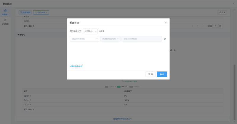 点击“数据筛选”可添加过滤条件进行数据筛选展示: