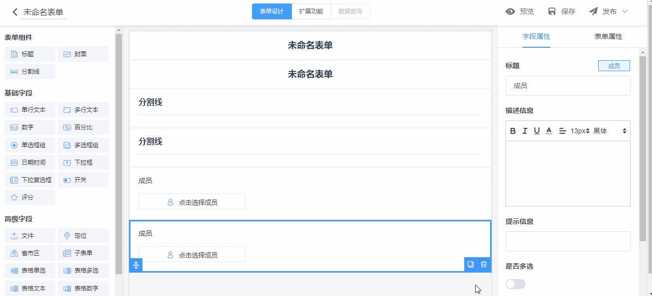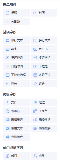 云表单目前支持26个字段,分为表单组件、基础字段、高级字段和部门成员字段。