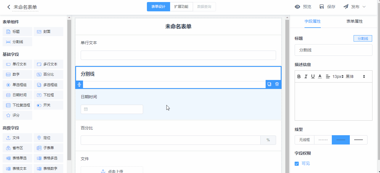 用于限定用户访问表单时对该字段的操作权限,包括:字段是否可见、是否可编辑。