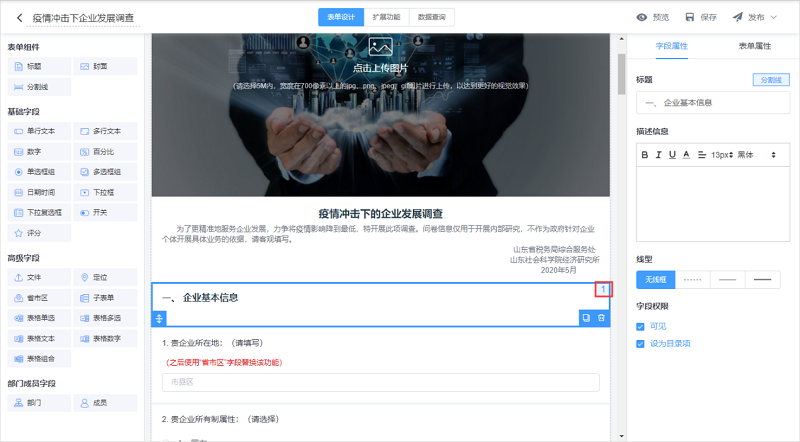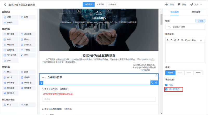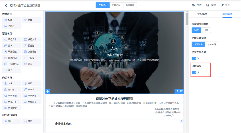移动端进行数据采集时,为了更好的适应移动端的操作习惯,提升数据采集时用户的体验,可开启“分项填报”,设置“目录项”,将表单拆分成一页一页的套表。