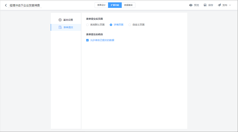 1 表单提交后页面2 表单提交后修改1 表单提交后页面设置表单提交后显示页面: 系统默认页面:显示系统默认页面并设置提示语句;详情页面:数据详情页面;自定义页面:可配置自定义跳转链接。2 表单提交后修改配置是否允许用户提交表单后进行数据修改。作者:guolibing 创建时间:2023-06-10 10:27最后编辑:guolibing 更新时间:2023-06-26 15:52