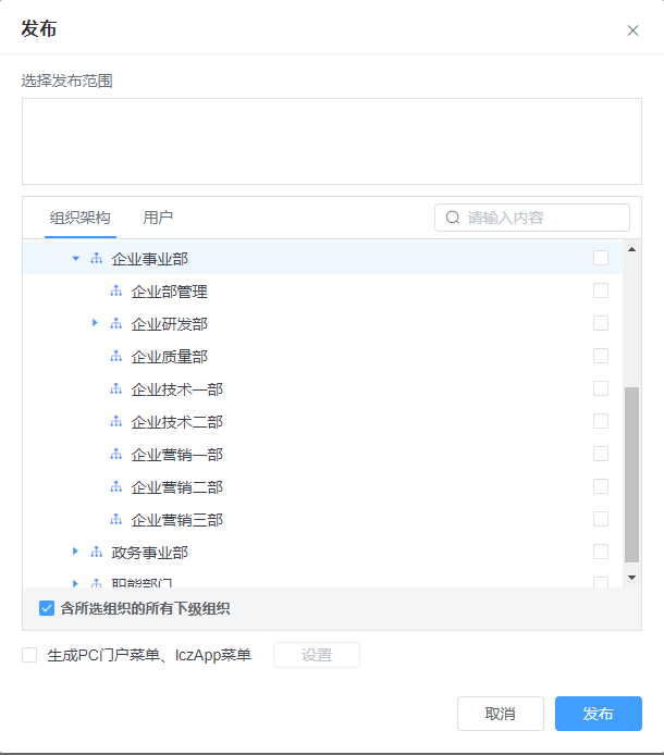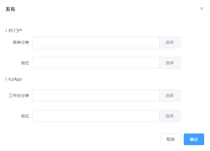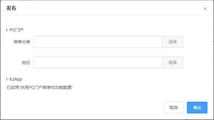 定向发布时,可选择生成PC门户菜单和lczAPP菜单:
