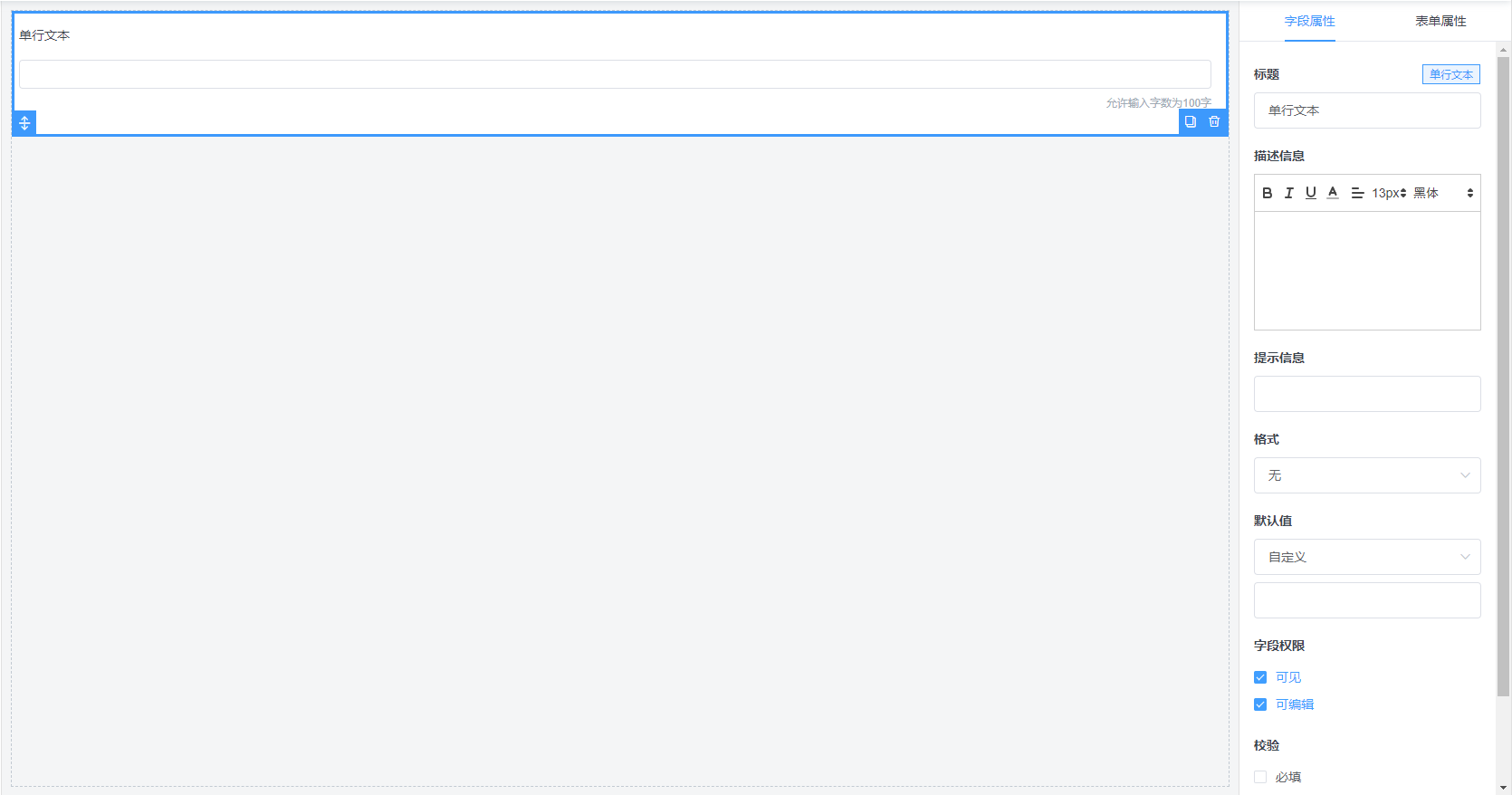 格式:在单行文本字段中,系统预设了几种常用的数据格式,起到了字段校验的作用。目前支持的类型包括: