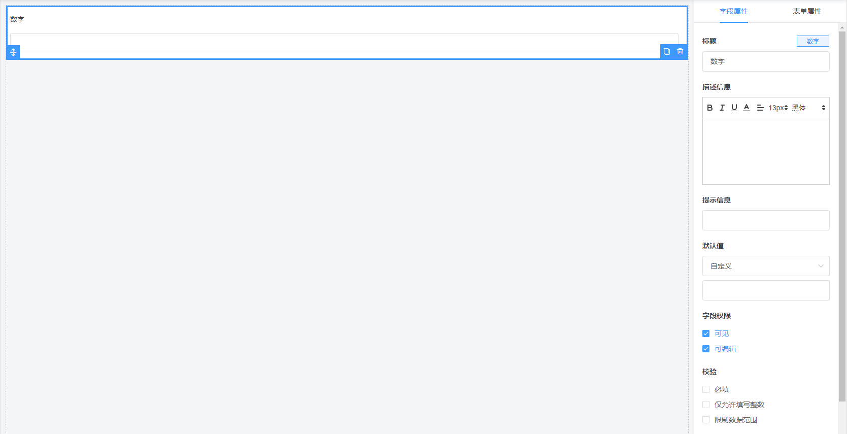 目录 搜索 展开 云表单简介快速入门表单管理表单设计制作过程基本操作表单组件标题封面分割线基础字段单行文本多行文本数字百分比单选框组多选框组日期时间下拉框下拉复选框多级下拉开关评分高级字段文件定位省市区子表单表格单选表格多选表格文本表格数字表格组合部门成员字段部门成员自动填充联动过滤选项关联表单属性移动端页面风格字段标题布局显示字段序号分项填报保存校验拓展功能基础设置表单提交表单预览表单发布公开发布定向发布数据查询专题介绍常见问题 暂无相关搜索结果! 数字 仅允许填写整数:校验输入的数字是否是整数;限定数据范围:校验输入的数字是否符合限定范围。作者:guolibing 创建时间:2023-06-21 15:23最后编辑:guolibing 更新时间:2023-06-26 15:52 扫码关注网盛数新公众号,获取更多帮助资料 上一篇:无 下一篇:无 提交评论