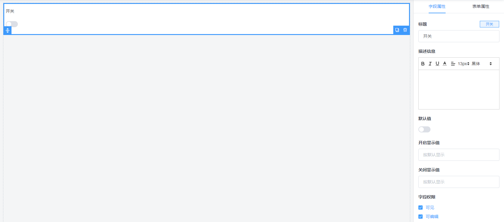开启/关闭显示值:允许配置开关开启和关闭的显示值主要用于仅有两种状态的业务,开启或关闭。作者:guolibing 创建时间:2023-06-21 15:24最后编辑:guolibing 更新时间:2023-06-26 15:52