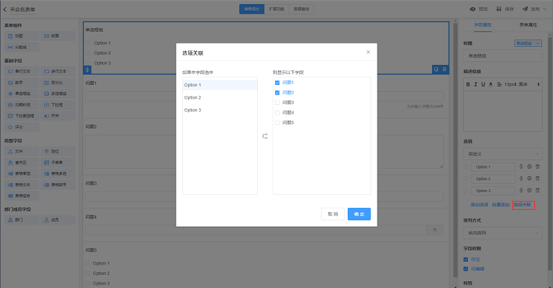 1 应用场景2 选项关联设置1 应用场景在调查问卷中,有时需要根据用户所选选项的不同,页面显示不同的待填项目,从不同的角度让用户回答对应问题。2 选项关联设置单选框组、下拉框可设置“选项关联”。 选中对应的选项,勾选右侧选择该选项时显示的字段即可。被关联的字段在表单展示时默认不显示,只有选中对应的关联选项时该字段才会显示。作者:guolibing 创建时间:2023-06-26 13:49最后编辑:guolibing 更新时间:2023-06-26 15:53