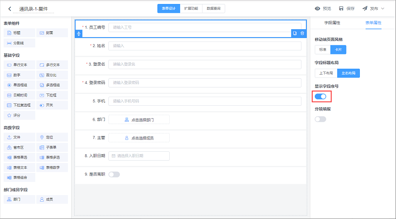 选择是否自动显示字段序号,默认不开启。 开启后在设计页面就可以看到效果,字段前面自动显示序号: 作者:guolibing 创建时间:2023-06-26 14:08最后编辑:guolibing 更新时间:2023-06-26 15:52
