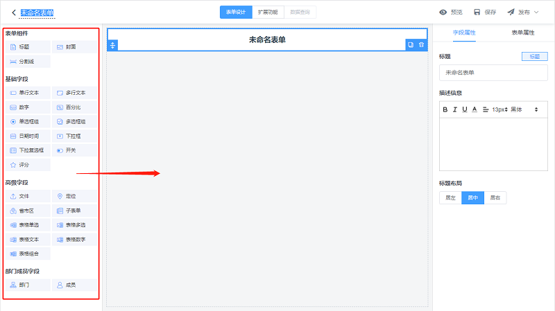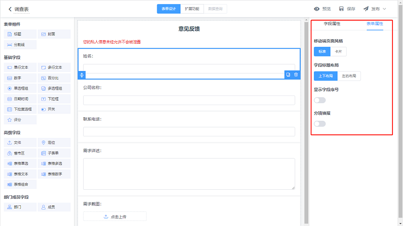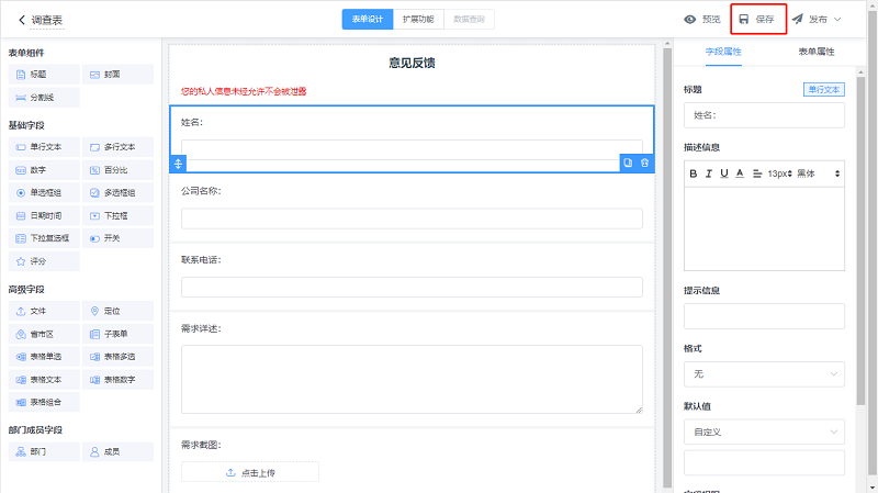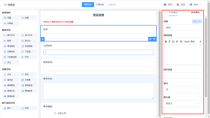 选中字段,可以在“字段属性”中设置该字段的标题、描述信息、提示信息、默认值、字段权限、校验等。