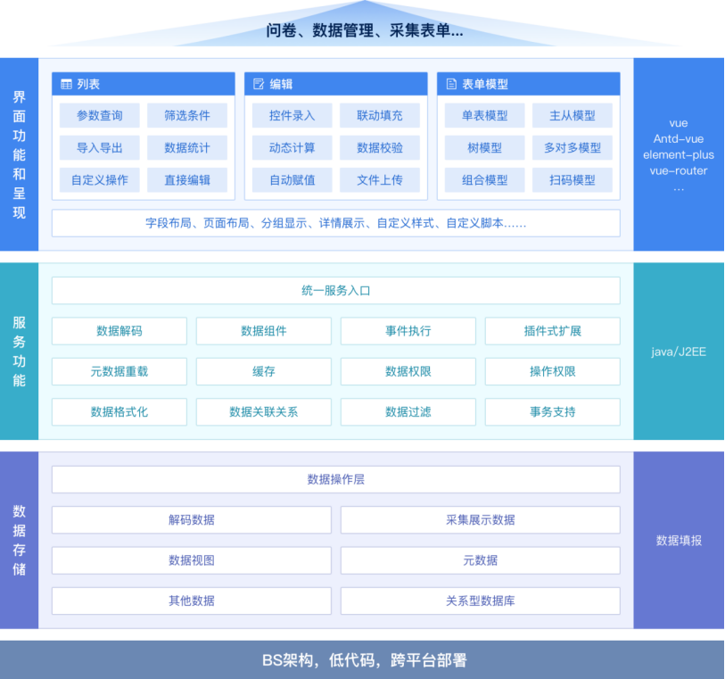 - 云表单面向于最终用户,不需要数据库等专业技能,不依赖于数据库表结构,即拖即用,适合于调查问卷等业务数据采集;