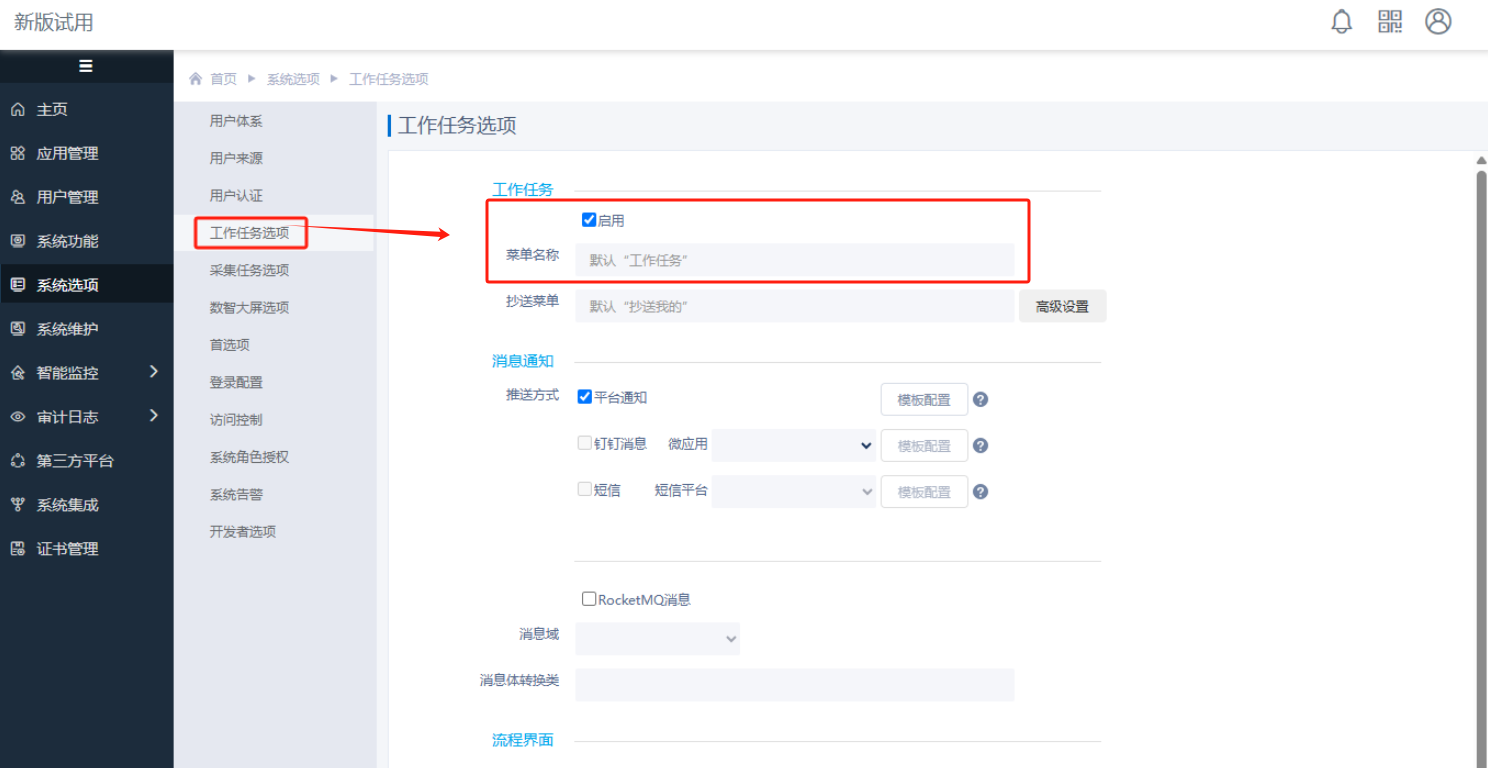 需要在系统管理员登录系统在[系统选项>工作任务选项]中开启相应功能方可使用,详细配置说明请查阅章节 工作任务选项>启用工作任务。