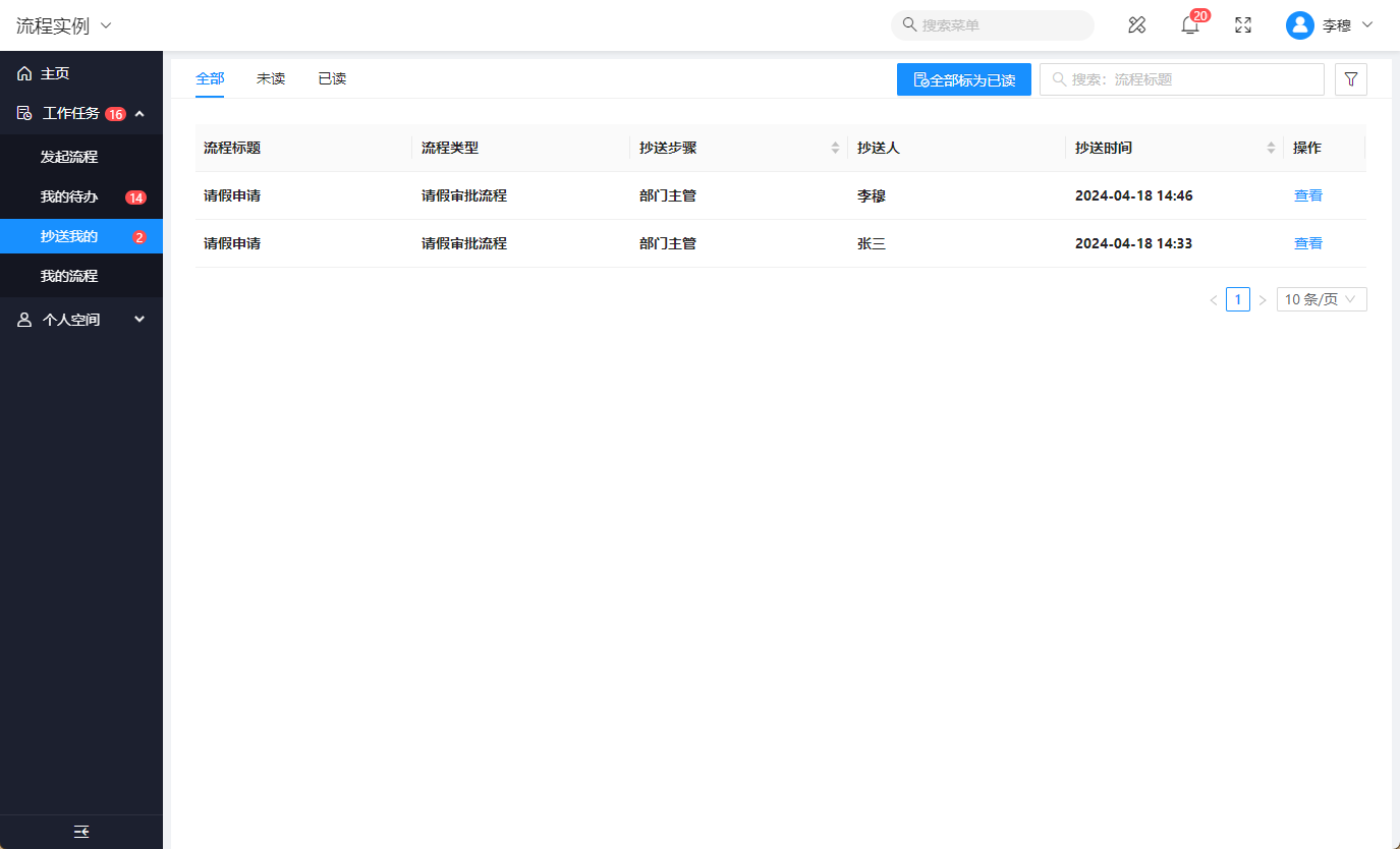 - 在【抄送我的】列表会列出所有在流程流转过程中通过 抄送功能 抄送给当前登录用户的流程,支持按是否已读等进行快速过滤,也支持按流程标题、流程类型、抄送人、抄送时间进行具体搜索。