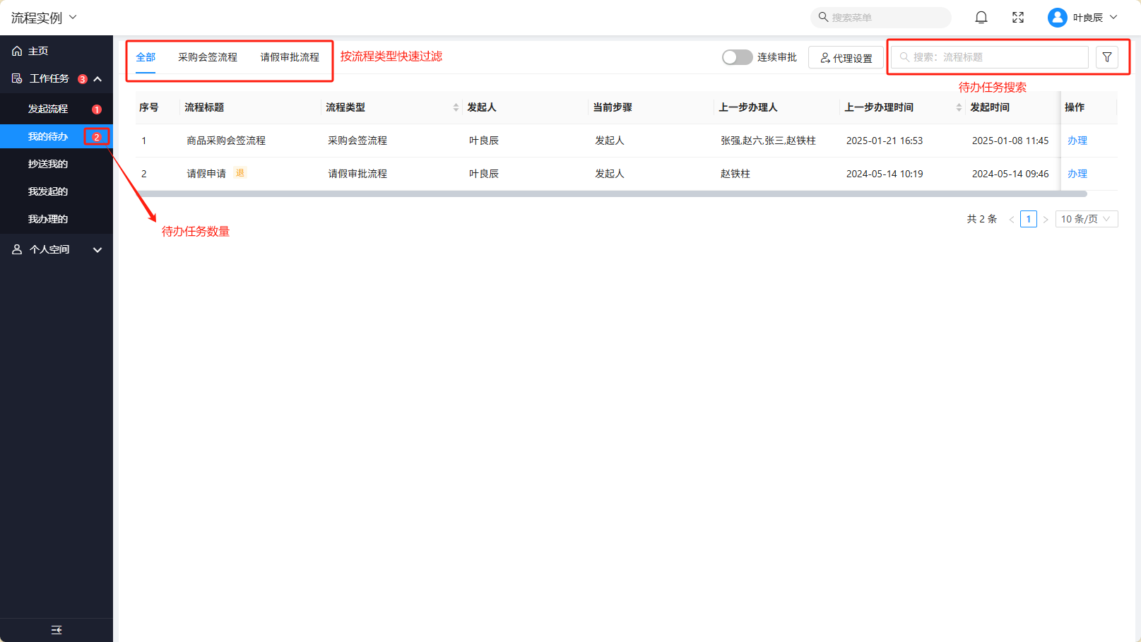 - 当存在未处理的待办任务时,【我的待办】菜单会显示待办任务数量。