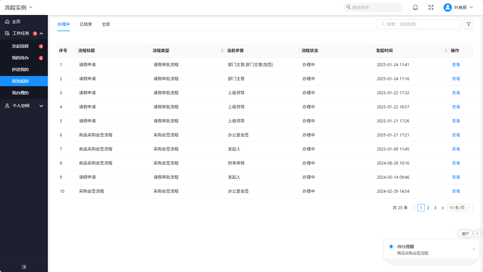 - 在【我发起的/我办理的】列表会分别列出所有与当前登录用户相关的流程,列表页面支持按“办理中”、“已结束”进行快速过滤查看想要查看的流程列表,也支持按流程标题、流程类型、发起时间等维度进行具体搜索。