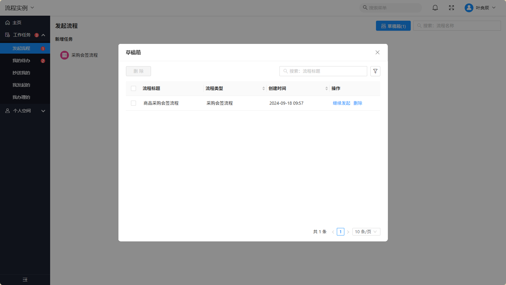 - 草稿箱:保存成功但未发起的流程发起表单数据会在草稿箱中显示,支持继续修改发起或删除。当草稿箱中存在未发起的表单数据时,【发起流程】菜单会显示相应的草稿箱中未发起流程数量。