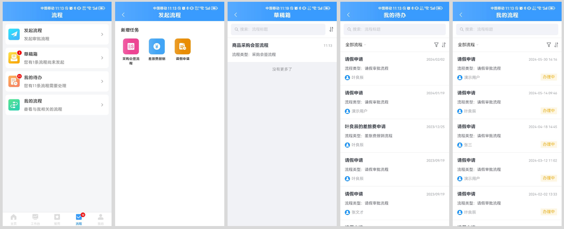 - 【发起流程】、【草稿箱】、【我的待办】、【我的流程】界面支持在移动端APP使用。
