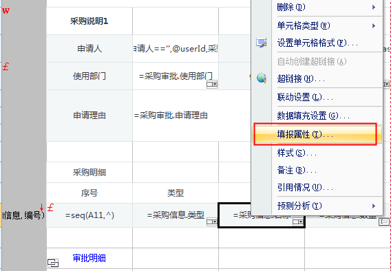 在被联动控件所在单元格 D11 右键选择“填报属性”,如下图:
