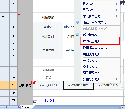 类别需要联动产品数据,那么就需要将类别所选的值传递给“类别”参数,在类别所在单元格右键选择“联动设置”,如下图: