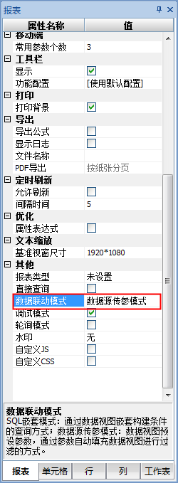 将报表属性中的为[数据联动模式]设置为“数据源传参模式”,如下图: