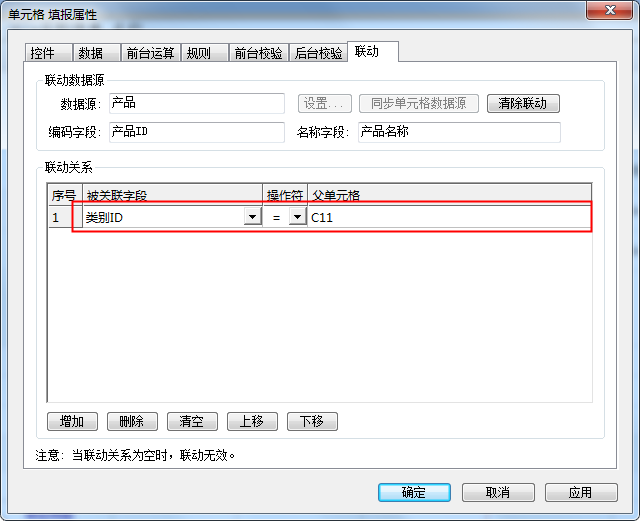 进入“联动”tab,设置联动关系:产品数据源中的字段“类别ID”=C11单元格值,如下图: