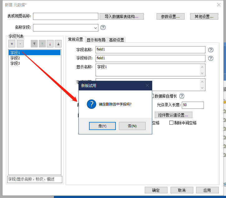 在字段列表选中字段后,单击【-】在确认弹窗内单击【确定】即可删除选中的字段,如下图所示。