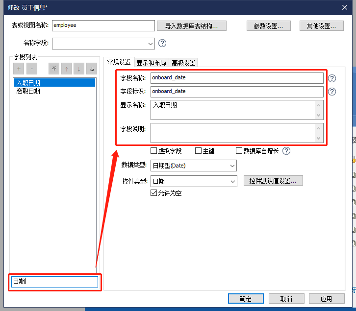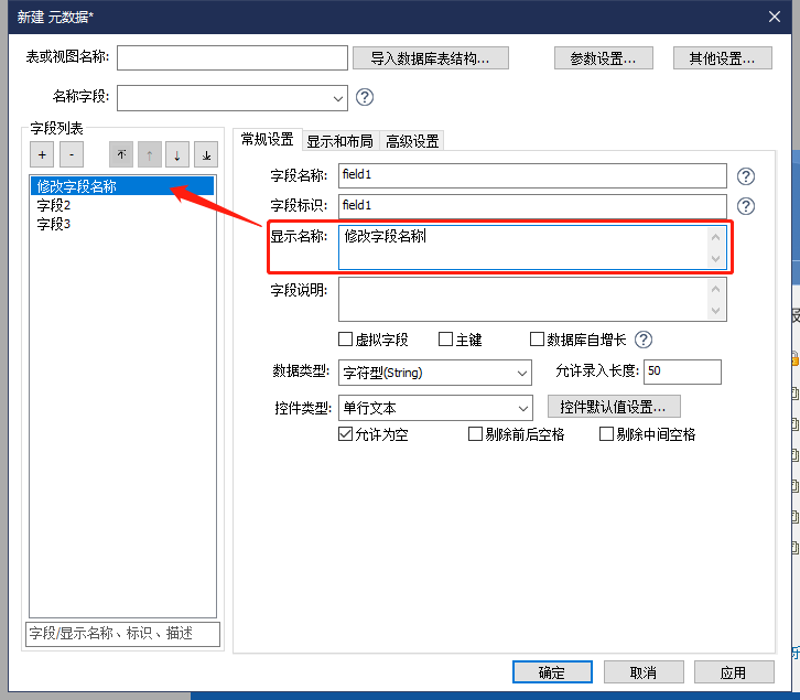 选中字段,在右侧【常规设置】的【显示名称】中可以修改左侧字段列表的字段显示名称。