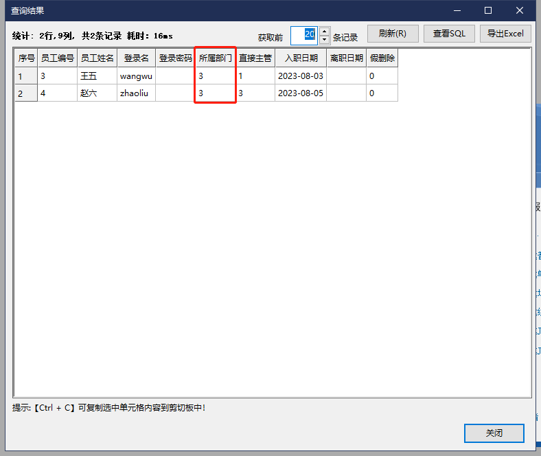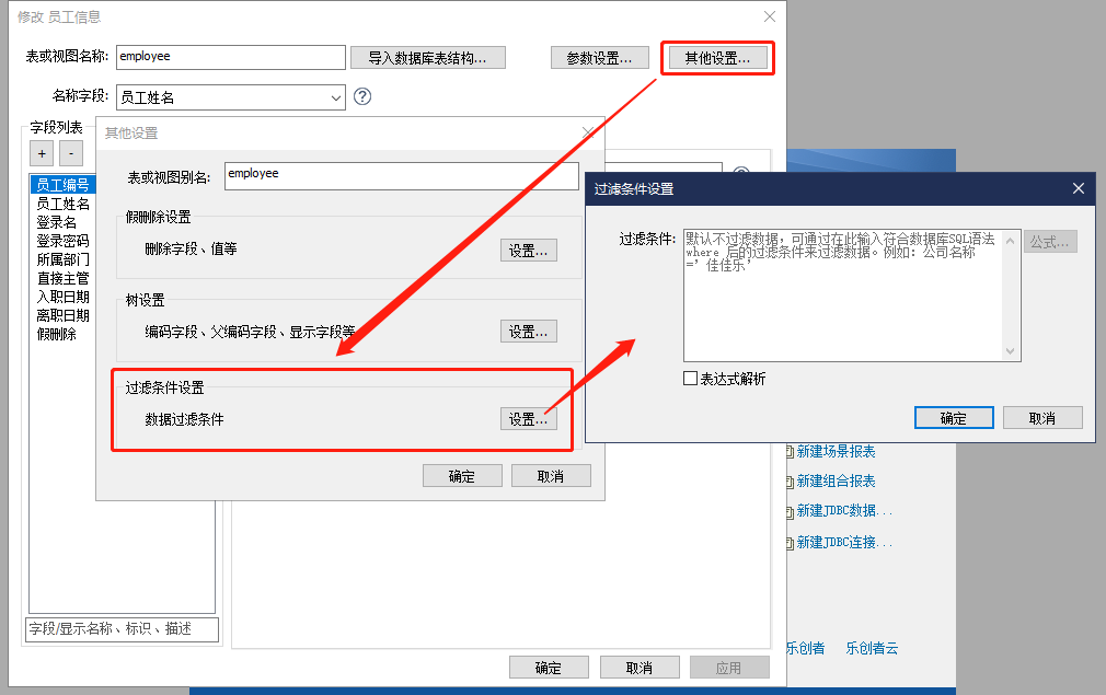 此处过滤条件的写法需要具备一定SQL语法基础,只需要填写SQL语句中WHERE后的过滤条件即可,假设当前元数据虽然使用了员工表,但只需要展示“财务部”的员工信息,就可以通过“所属部门”字段在元数据配置时就进行条件过滤,假设财务部的部门编码为3,过滤条件就可以写作department_code = 3