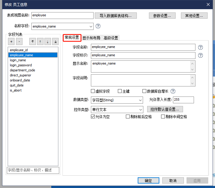 字段的常规设置,指的就是元数据配置界面【常规设置】一栏的配置,主要涉及字段的字段名称、字段标识、显示名称、字段说明、主键、自增长、数据类型、控件类型、默认值等字段基础描述的设置,如下图所示:
