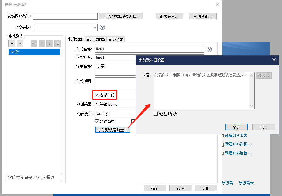 实际应用中有一些字段是不需要在数据库中实际存在的,只作为表单界面的呈现、数据计算或参数传递等虚设的字段,既不会去直接读取数据库,也不需要回写数据库,这类字段我们将其定义为“虚拟字段”。