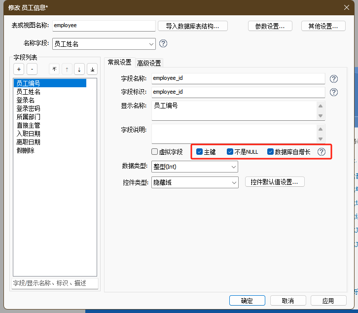 如数据库表中设置字段为主键,导入字段的时候会自动勾选【主键】项。此外,系统会为主键字段默认设置为“隐藏域”的控件类型,因为主键若是自动生成的,在一般情况下将作为不需要编辑的字段,不会展示给填表用户。