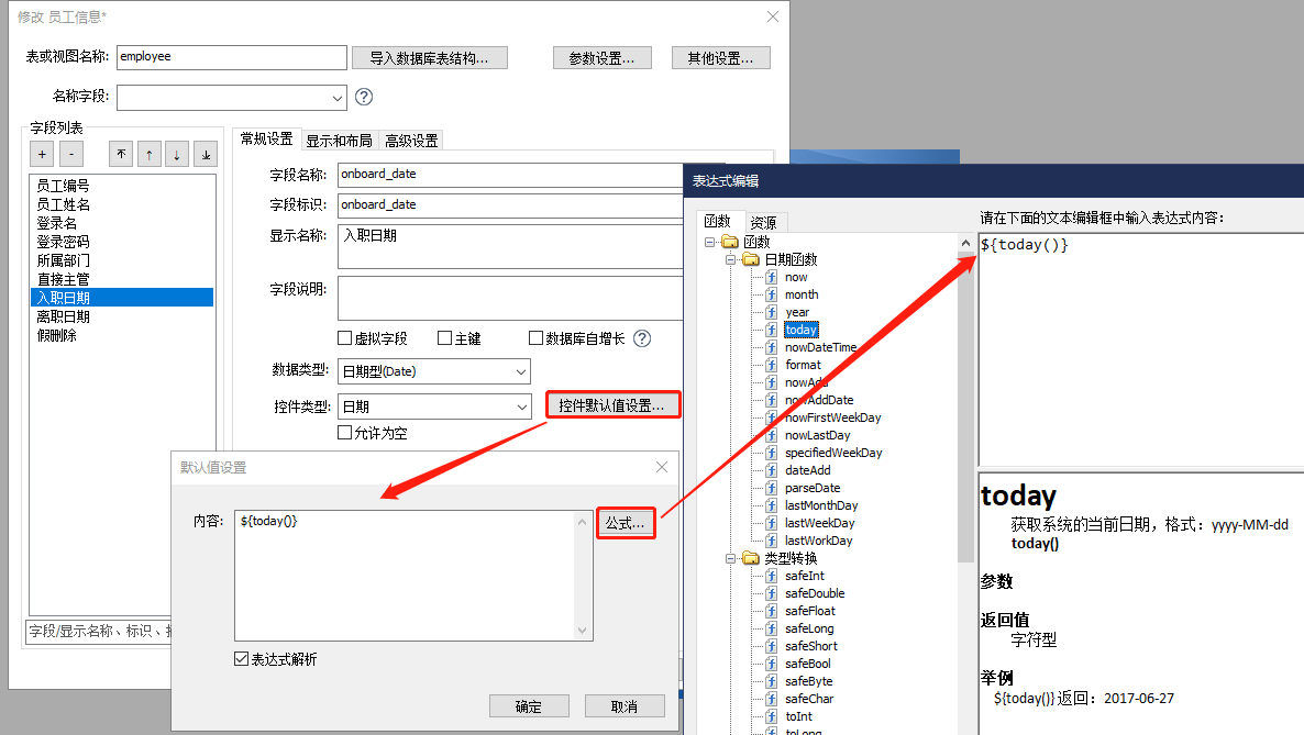 例如:员工信息需要入职当天录入,可将“入职日期”字段的默认值设置为当天,在“公式>函数”下可以找到函数${today()用于获取当天的日期,可以一定程度减轻填写人员的工作量。又例如在本案例中,考虑到员工信息一般为入职当天录入,可将“入职日期”字段的默认值设置为当天,在“公式>函数”下可以找到函数${today()用于获取当天的日期,可以一定程度减轻填写人员的工作量。