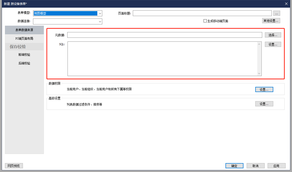 (1)视图模型的关键配置是首先需要选择一个元数据,使用元数据定义的二维集的字段;