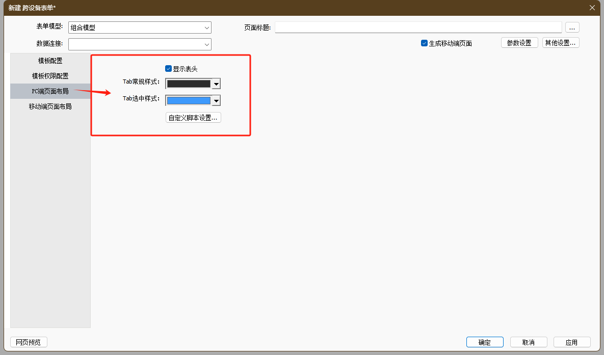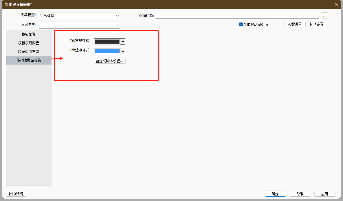 - 生成移动端页面:默认不勾选,勾选后显示【移动端页面布局】菜单。