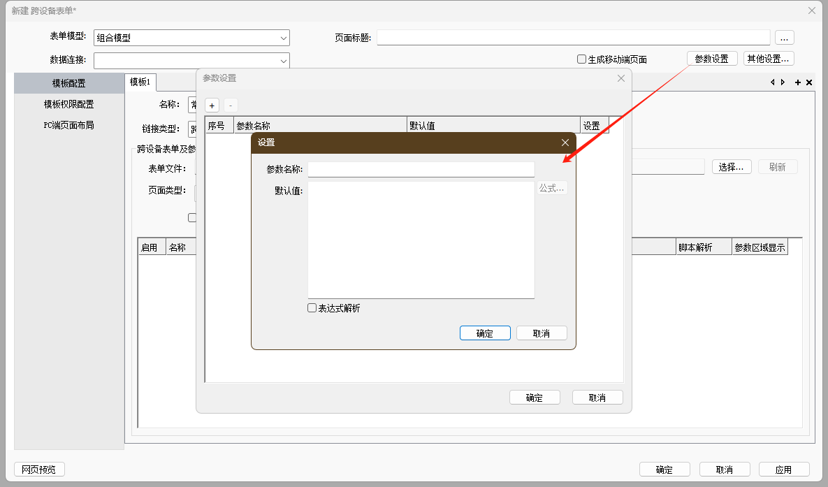 - 参数设置:可以定义模版的参数,配置后前端界面不显示,可以接收常量和表达式,一般可以接收例如系统变量、函数、来源于外部的参数赋值,用来给各个tab模版的参数传值使用。【参数设置】配置如下: